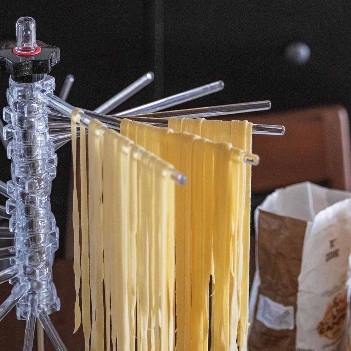 Wenn der Nudelteig bereit und im gewünschten Format geschnitten ist, fehlt nur noch das ideale Zubehörteil, um die Nudeln vor dem Kochen auszubreiten und zu trocknen: Tacapasta.